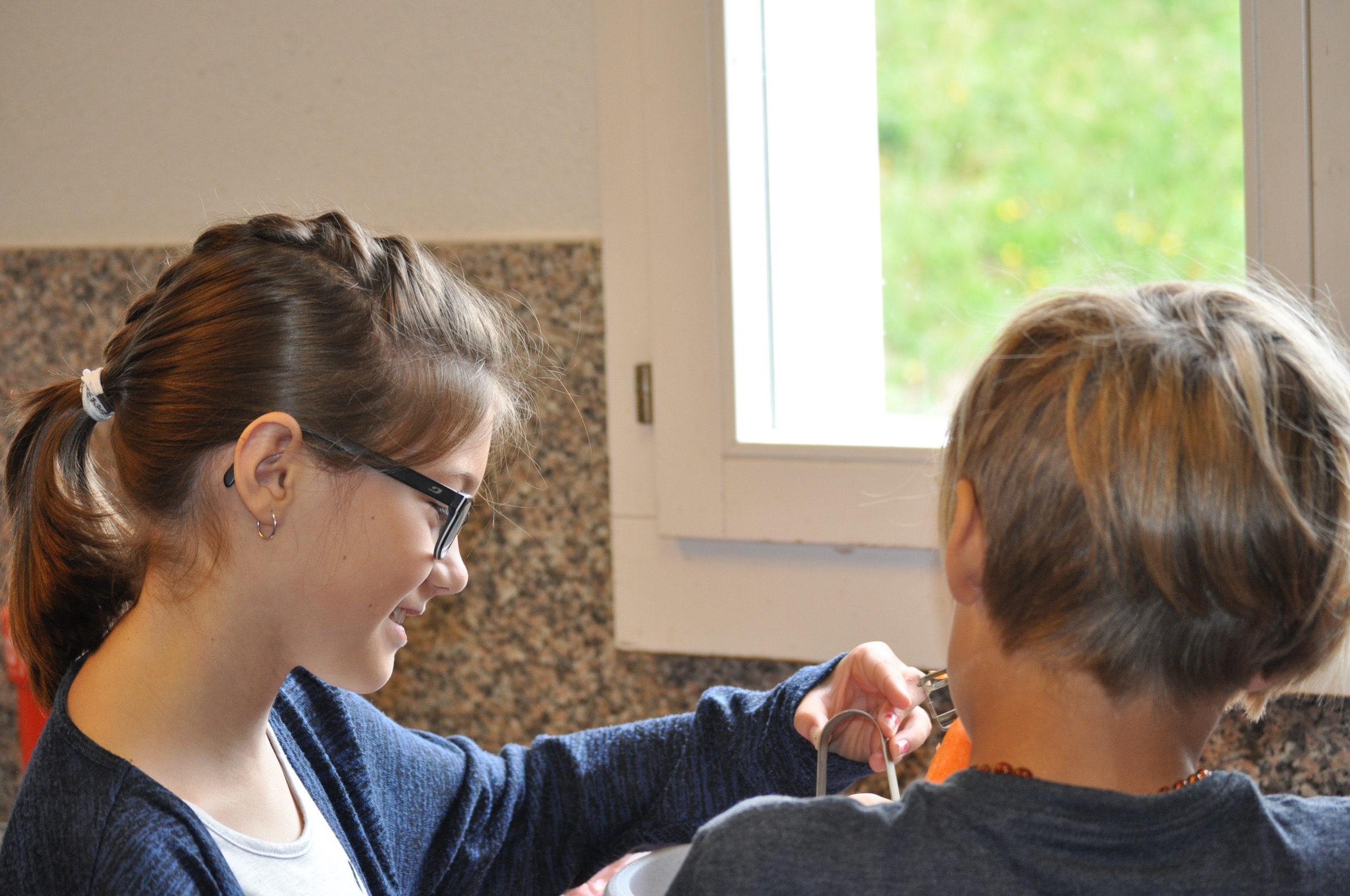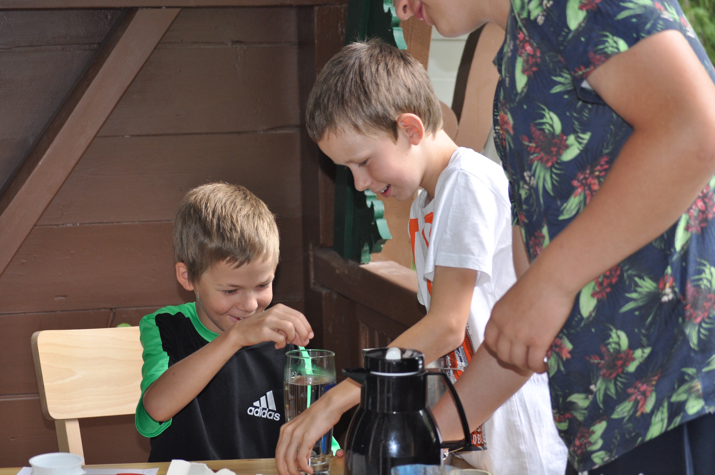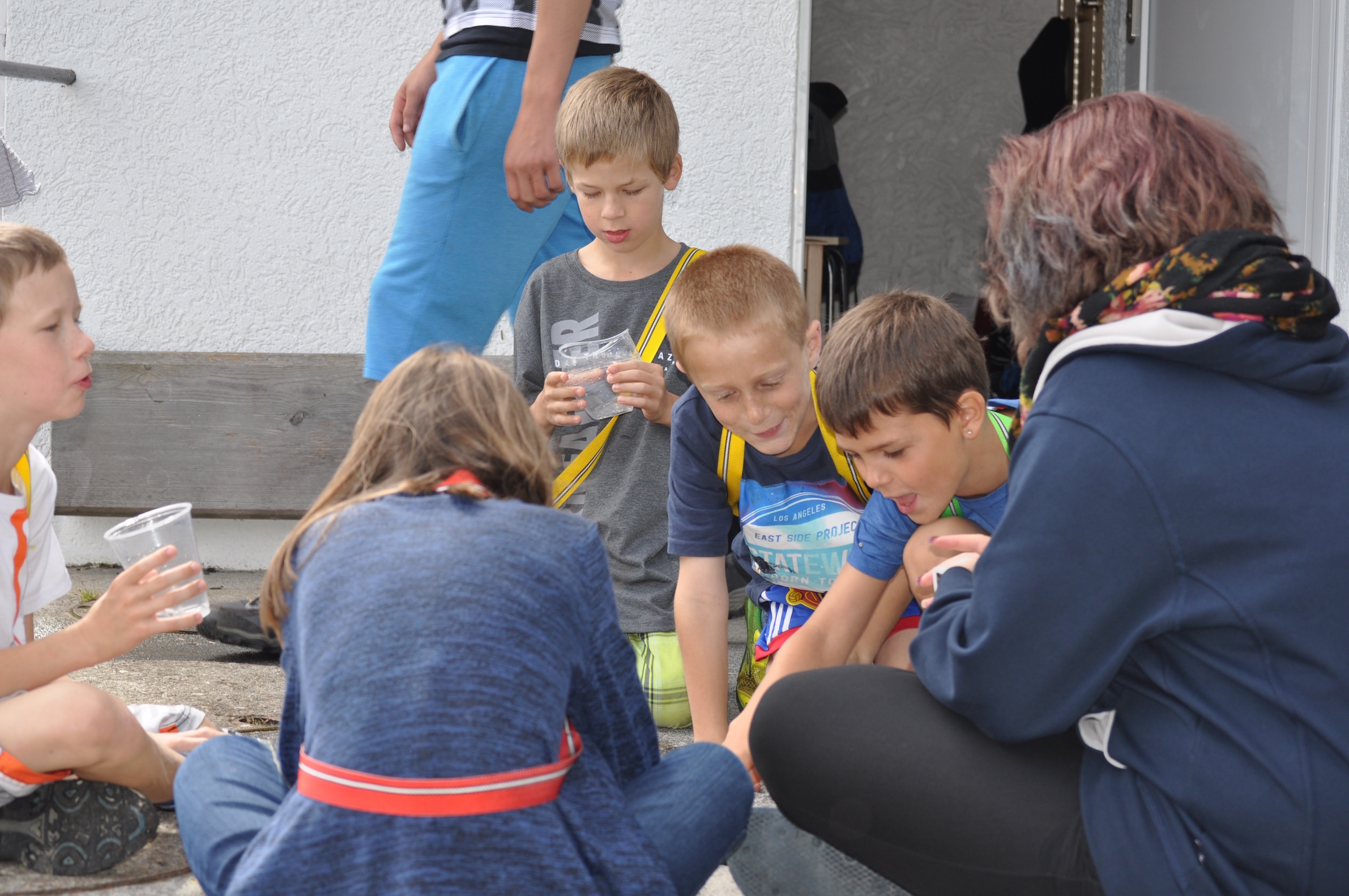 Sonntagmorgen, die erste Nacht ist überstanden! Als Olivia Einstein, die Grosscousine der Enkelin, der Tante des Onkels von Albert Einstein in die Zimmer und Zelte schreitet um Tagwacht zu machen, wird sie bereits von vielen hellwachen Augen angestarrt. Nachdem beim Frühstück ausgedehnt über die einfachen Dinge des Lebens, wie zum Beispiel die Relativitätstheorie diskutiert wurde, konnten unsere Kids gleich selbst in die Forscherrolle schlüpfen. Diverse Experimente wurden in einem Parcours erledigt und nun wissen alle wie man ein Ei gerade hinstellen kann oder wie man bei einem Ballon die Luft entleert, ohne dass dieser Beschädigt wird. Die Experimentierrunde wurde mit einer köstlichen Hot Dog- Party beendet.