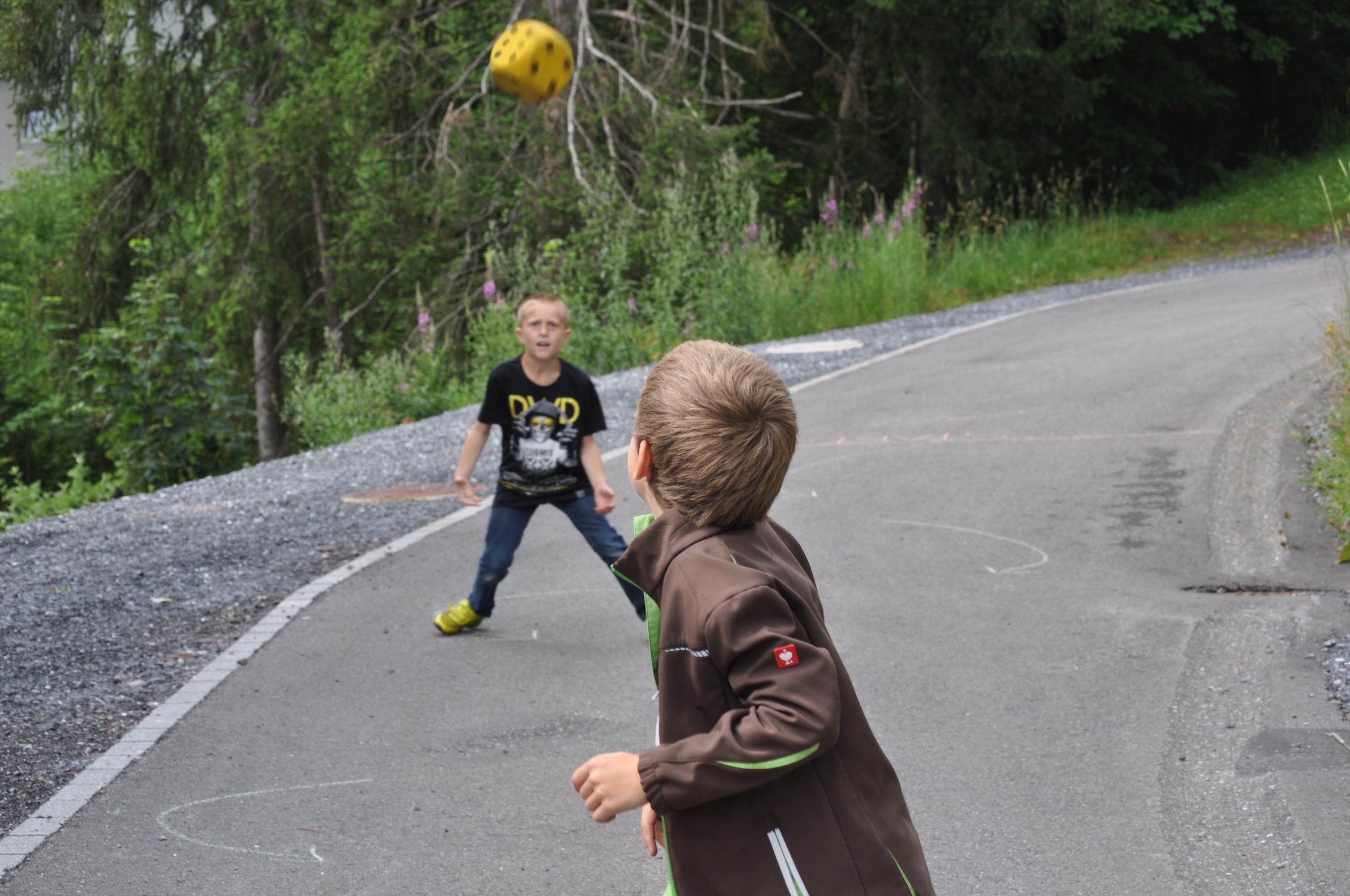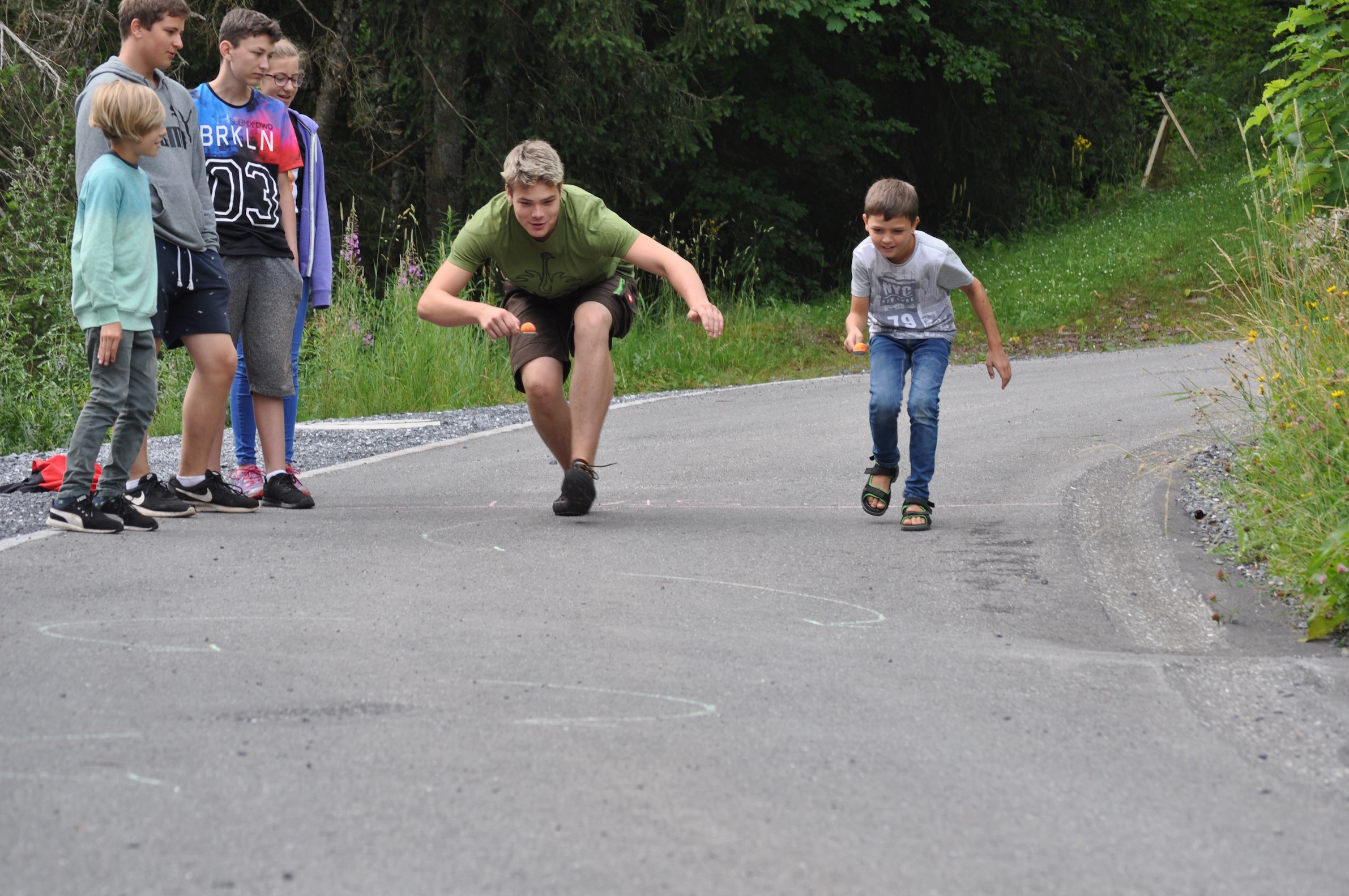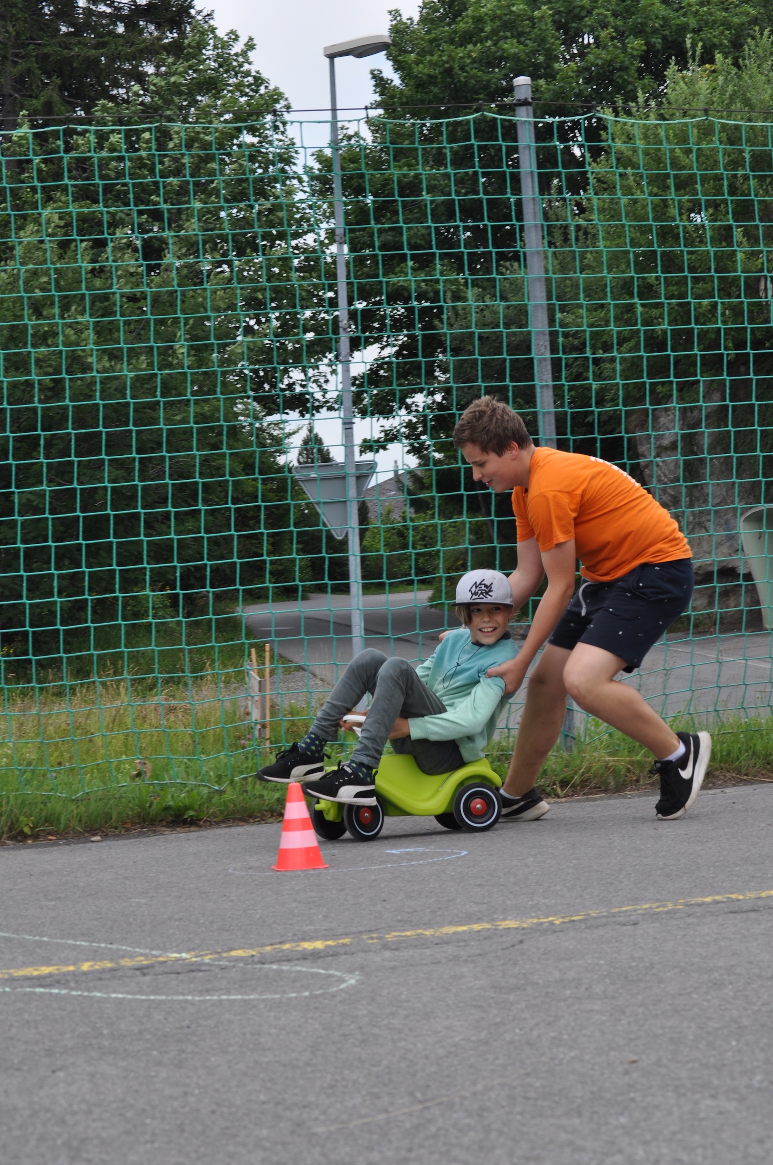 Bei prächtig durchzogenem Wetter wurde ein lebensgrosses MarioKart-Rennen gespielt. Lange Beine waren für ein Mal kein Vorteil, als in Zweierteams durch das aufgezeichnete Land gefahren und gerennt werden musste. Bananenschalen und Bälle die vom Gegner geworfen wurden und bei getroffenen Spielern Strafsekunden mit sich zogen, stellten grosse Hindernisse dar und wieder war Geschicklichkeit in Kombination mit Schnelligkeit und Teamfähigkeit gefragt. Ausgelassen wurde dabei die letzte Runde, da leider auch in Virtual-Reality-Games Gewitterregen nicht sehr hilfreich ist. Somit wurde die letzte Runde durch einen schnellen Marsch nach Hause ersetzt. Dort wartete die Dusche, die vor allem unsere Kleinsten nur wiederwillig gegen wertvolle Spielzeit eintauschten. Alle wieder sauber und trocken im Warmen war es, aber schon bald an der Zeit für s Znacht.