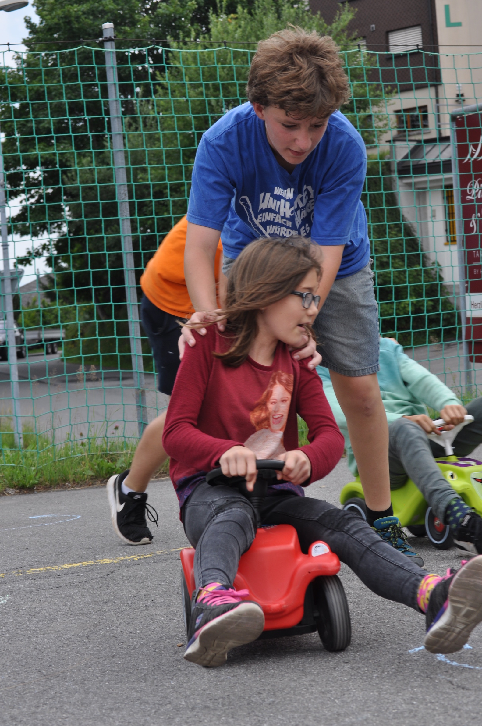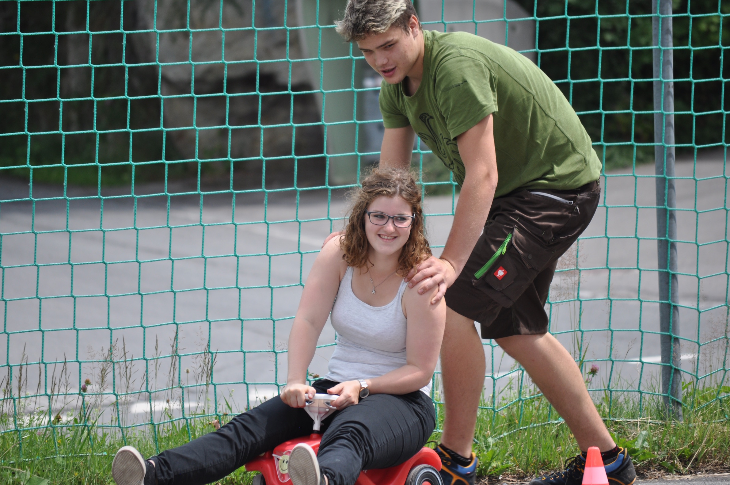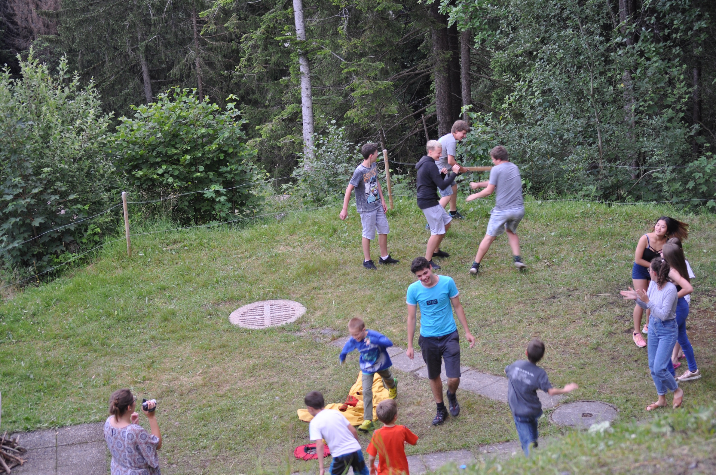 Bei prächtig durchzogenem Wetter wurde ein lebensgrosses MarioKart-Rennen gespielt. Lange Beine waren für ein Mal kein Vorteil, als in Zweierteams durch das aufgezeichnete Land gefahren und gerennt werden musste. Bananenschalen und Bälle die vom Gegner geworfen wurden und bei getroffenen Spielern Strafsekunden mit sich zogen, stellten grosse Hindernisse dar und wieder war Geschicklichkeit in Kombination mit Schnelligkeit und Teamfähigkeit gefragt. Ausgelassen wurde dabei die letzte Runde, da leider auch in Virtual-Reality-Games Gewitterregen nicht sehr hilfreich ist. Somit wurde die letzte Runde durch einen schnellen Marsch nach Hause ersetzt. Dort wartete die Dusche, die vor allem unsere Kleinsten nur wiederwillig gegen wertvolle Spielzeit eintauschten. Alle wieder sauber und trocken im Warmen war es, aber schon bald an der Zeit für s Znacht.