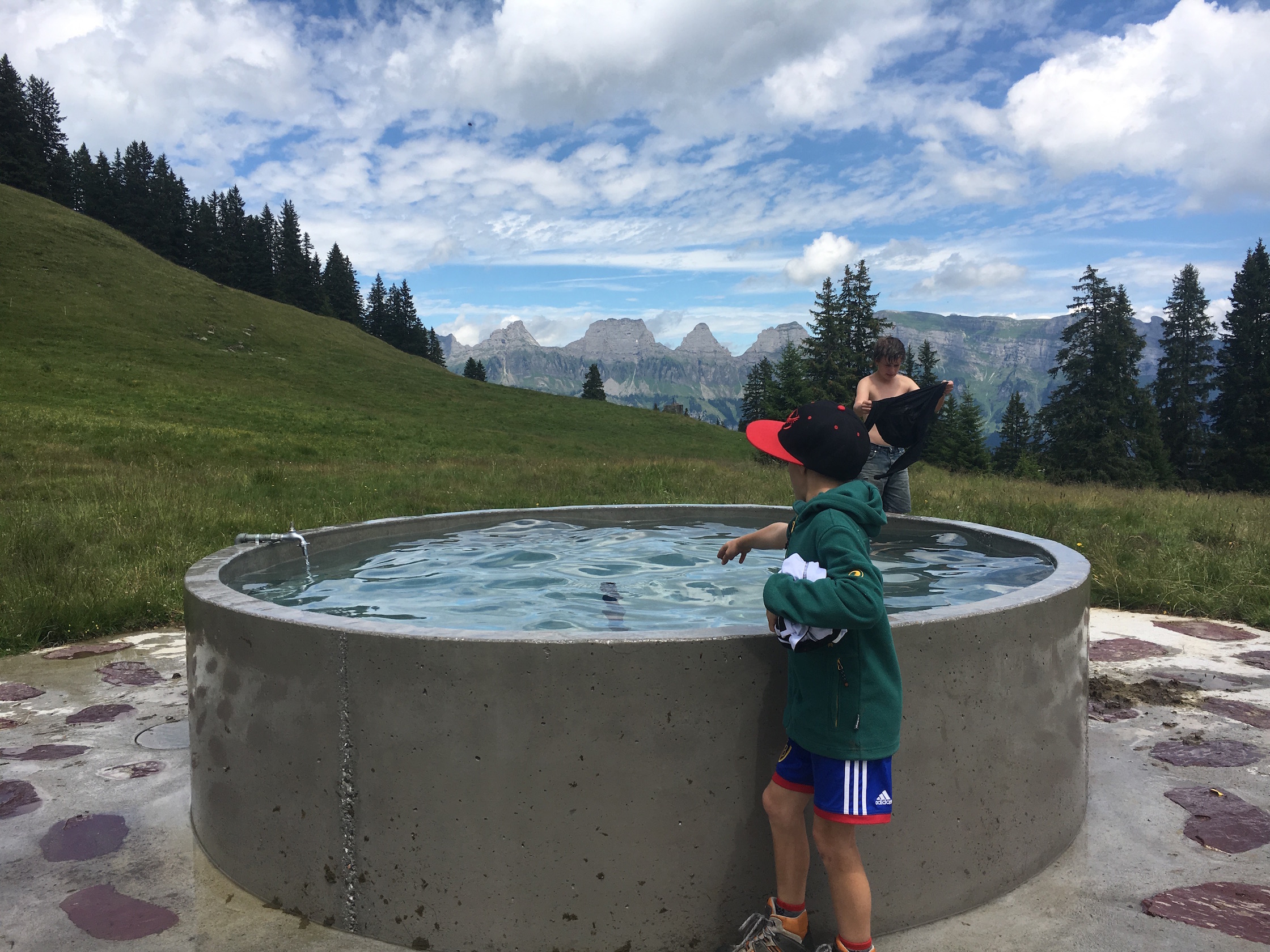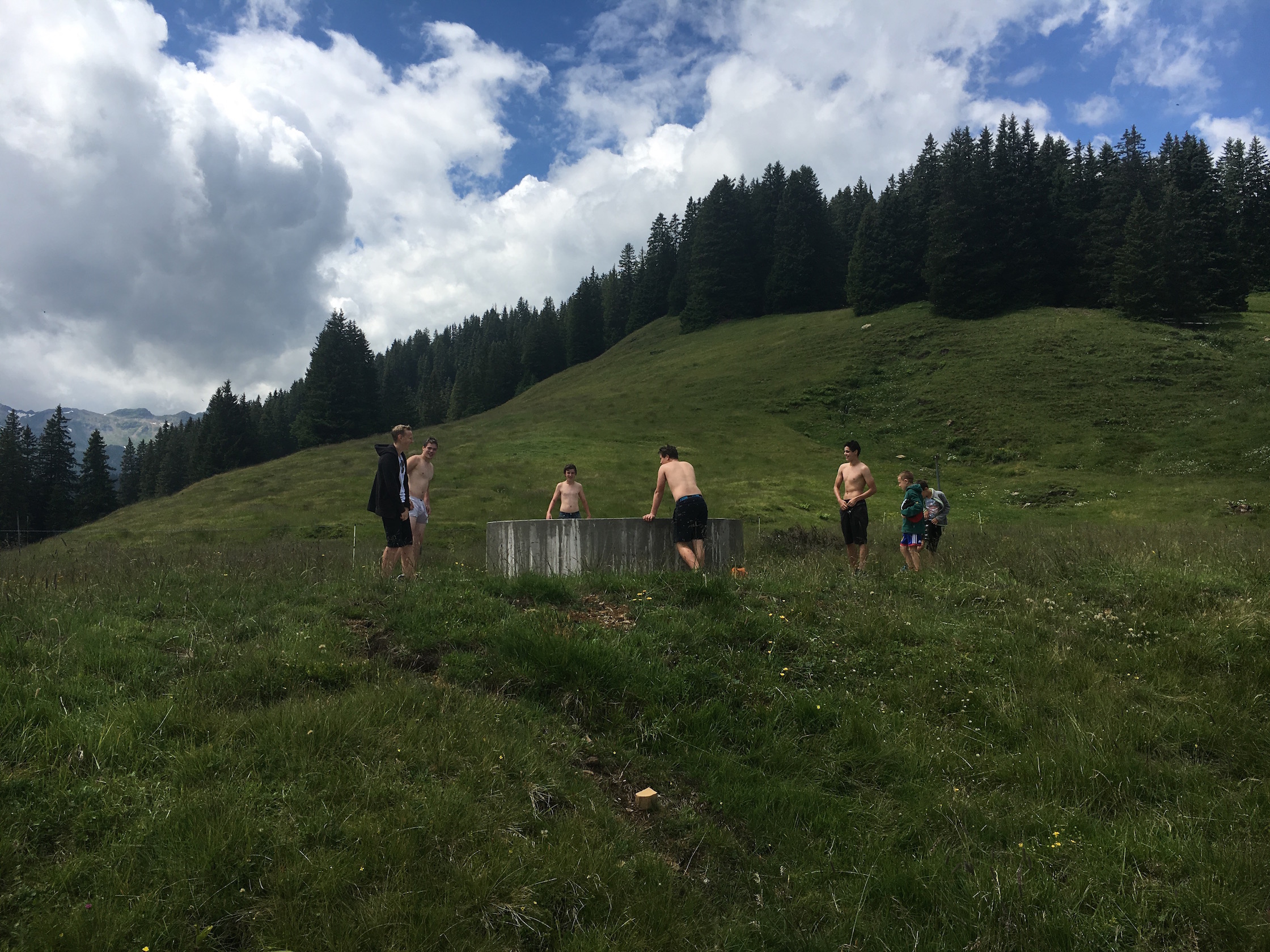 Mässig warme 18 Grad waren den grössten und furchtlosesten JuBlanern egal, als sie oberhalb des Rastplatzes einen Outdoorpool/ eine Luxus Kuhtränke entdeckten. Kurzum wurde entschieden, dass es nun an der Zeit für ein kaltes Bad war. Dazu muss man erwähnen, dass die Waschmöglichkeit gerne angenommen wurde als klar war, dass sich die grossen, braunen Flecken in der Wiese nicht zum reinlegen eigneten. Kühe hatten wohl vorher die Wiese belagert und somit auch ihre Geschäfte dort erledigt.